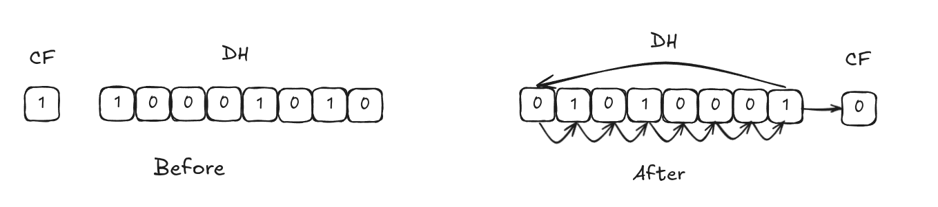 b. Suppose DH contains 8AH, CF=1 and CL contains 3. What are the values of DH and CF after the instruction is executed:03