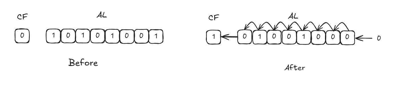 A 0 is shifted into the rightmost bit position and the MSB is shifted into CF. Multiplies the value by 2 in each shift. Example: