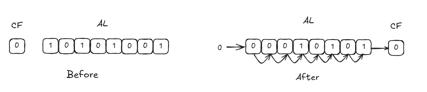 A 0 is shifted into the MSB position and the rightmost is shifted into CF. Divides the value by 2 in each shift. Example:
